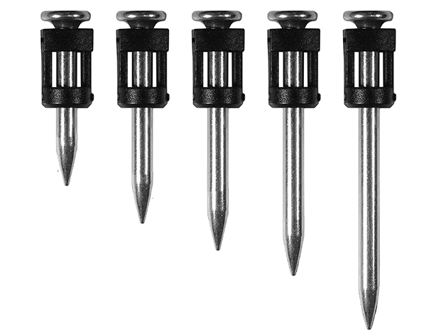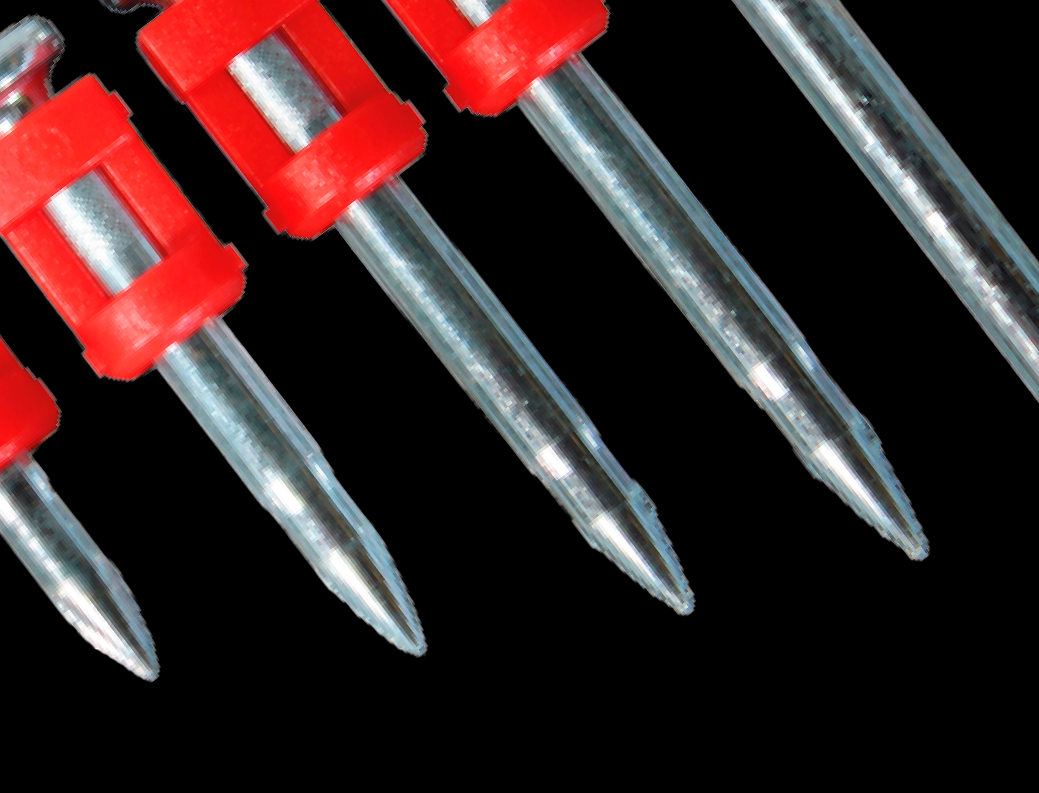 Ząbkowana powierzchnia gwoździa poprawia trzymanie w twardych materiałach, takich jak beton i stal.